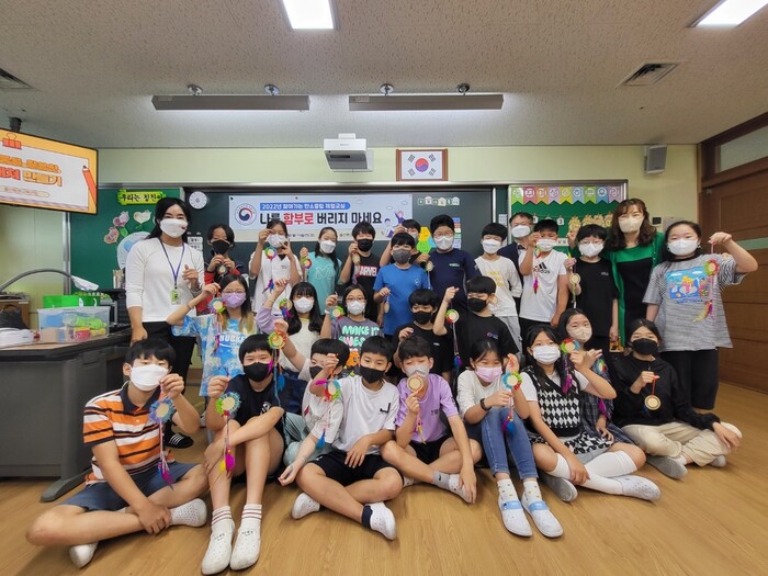 | ▲ 15일 울산 울주군 언양초 5학년 25명을 대상으로 시행한 '탄소중립 체험교실'을 마치고 울산환경교육연합 강사와 학생들이 재활용품으로 만든 드림캐쳐를 들고 기념촬영을 하고 있다. (사진, 한국동서발전 제공) |