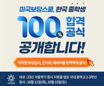 나무컨설팅은 오는 10월 11일과 15일 총 2회에 걸쳐 본사에서 한국 중학생들을 위한 미국 명문 보딩스쿨 입시 세미나를 진행한다고 밝혔다.