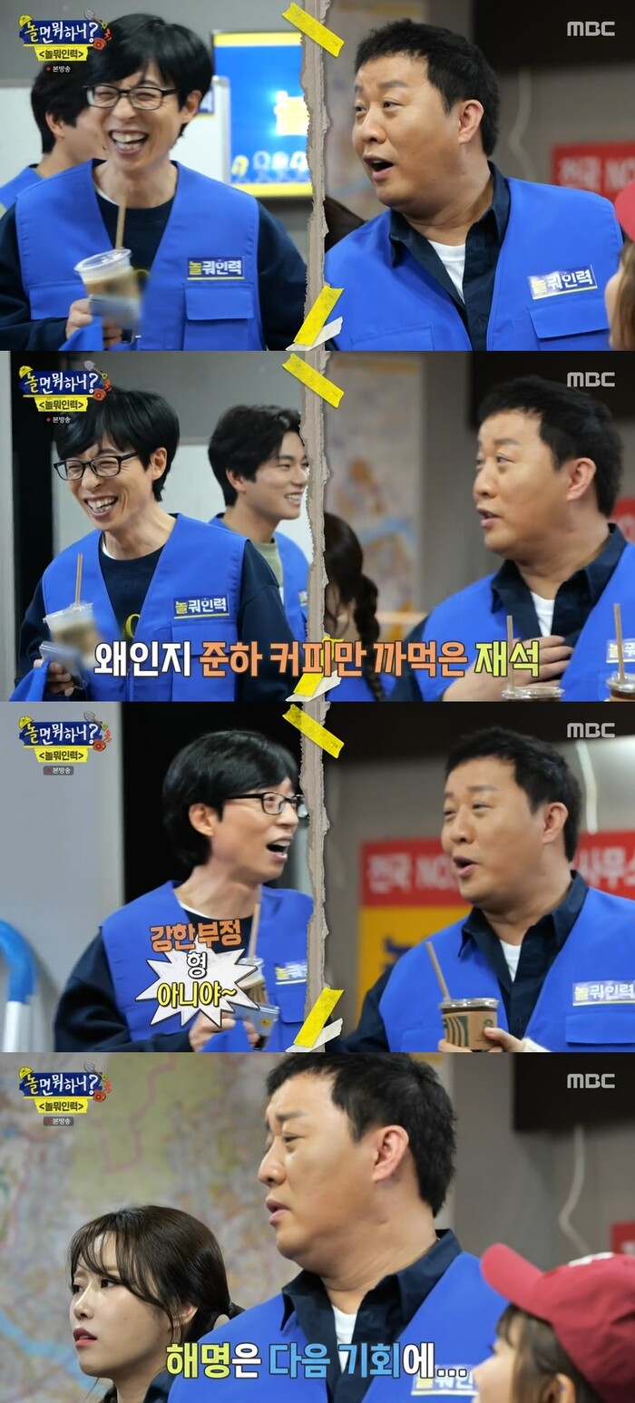 이날 방송에서 유재석은 멤버들에게 커피를 선물했다. 하지만 정준하 것은 없었다. 그러자 유재석은 "내가 간장게장 때문에 이러는 건 아니니 오해 마라"고 했다.