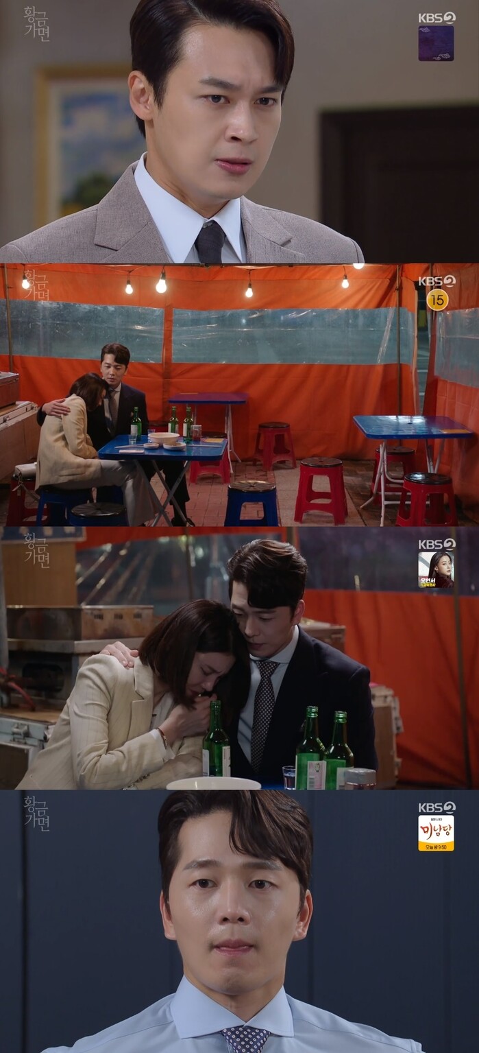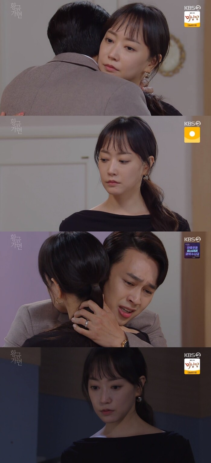5일 저녁 7시 50분 방송된 KBS2TV '황금 가면' (연출 어수선/극본 김민주)32회에서는 홍진우(이중문 분)이 전 아내인 유수연(차예련 분)을 찾으며현 현 아내 서유라(연민지 분)를 안는 모습이 그려졌다.
