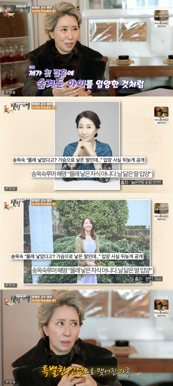 이에 송옥숙은 "당시 내가 딸을 몰래 낳았다는 루머도 있어서 입양사실을 밝혔다"고 밝혔다.