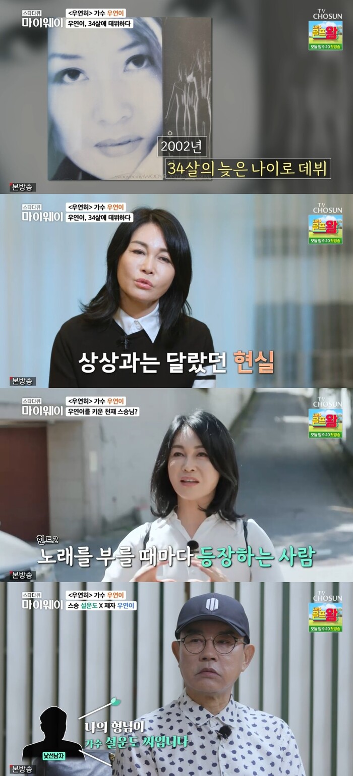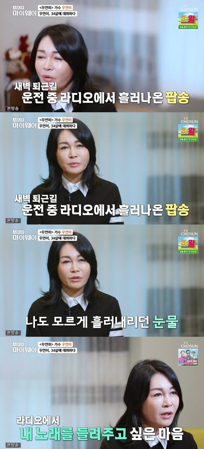 그러면서 우연이는 "어느 날 운전을 하고 가는데 라디오에서 좋아하는 팝송을 들었는데 눈물이 주룩주룩 나서 '아 나도 앨범을 내서 라디오에 나올 수 있겠구나' 그런 생각을 하고 1집 앨범 '남자인데'라는 곡을 냈다"며 34살 늦은 나이로 데뷔했다고 고백했다.