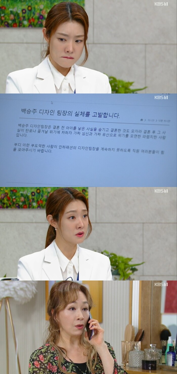 이날 방송에서 백승주는 출근하자마자 사내 게시판에 자신이 서힘찬(김시우 분)을 낳고 버린 것, 강성욱(이시강 분)과 결혼 한 뒤 가짜 임신과 가짜 유산을 한 일 등이 모두 폭로 당한 것을 봤다.