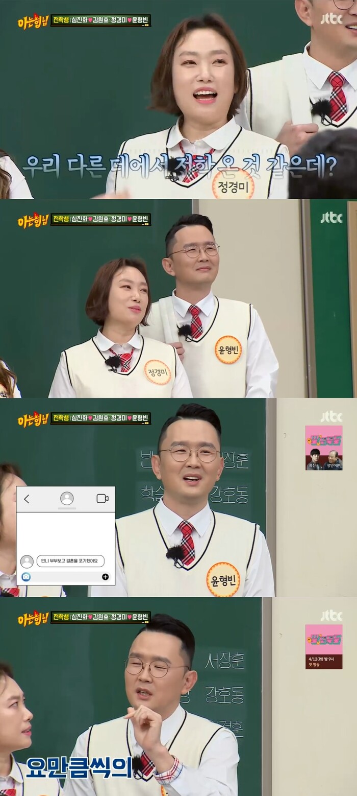 정경미는 "다들 심진화 김원효 부부 보고 결혼하고 싶다 했는데 우린 '1호가될순 없어' 방송 후 결혼 하기 싫다는 사람이 있었다"고 했다. 이에 윤형빈은 "약간의 착시효과다"라고 했다.