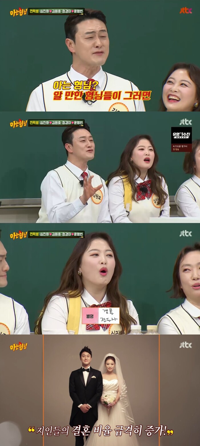 9일 밤 8시 40분 방송된 JTBC '아는형님'에서는 김원효, 심진화, 정경미, 윤형빈의 등장이 그려졌다.