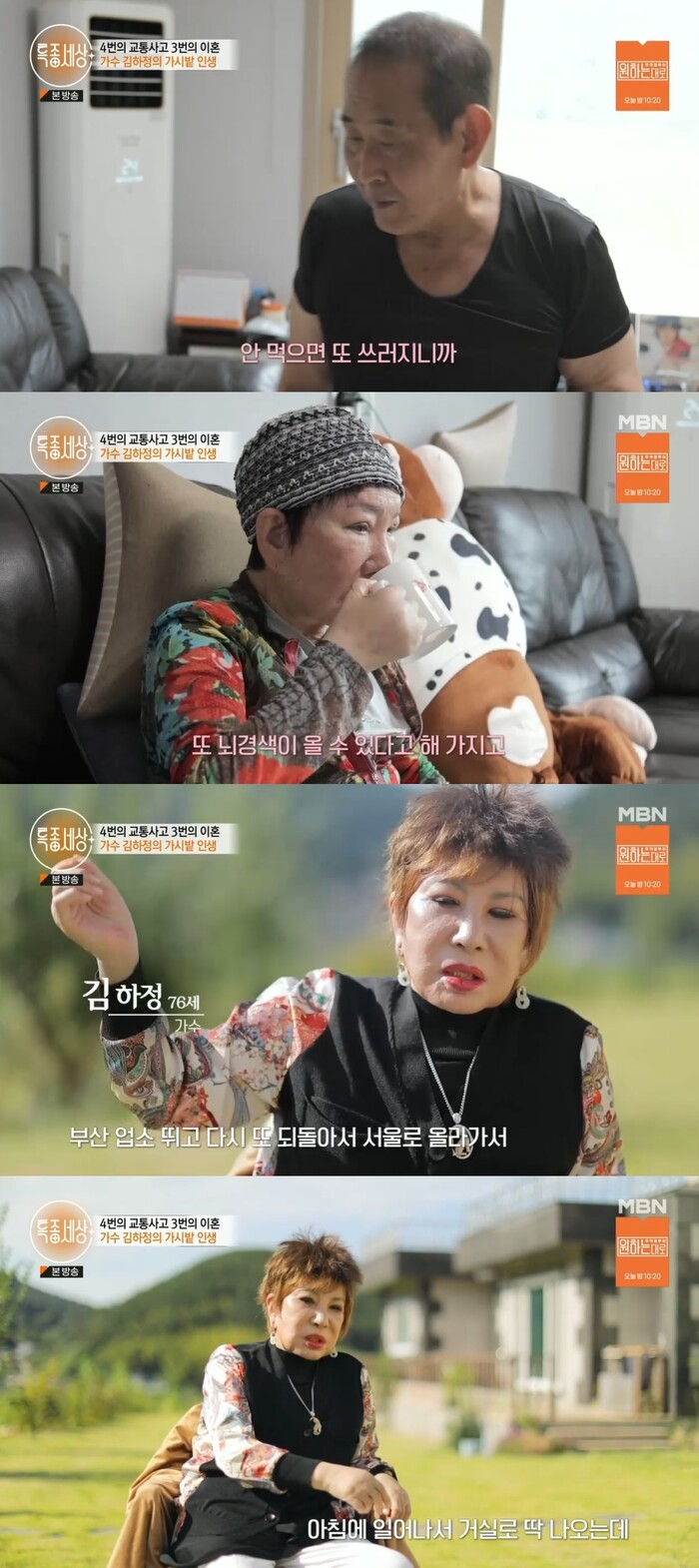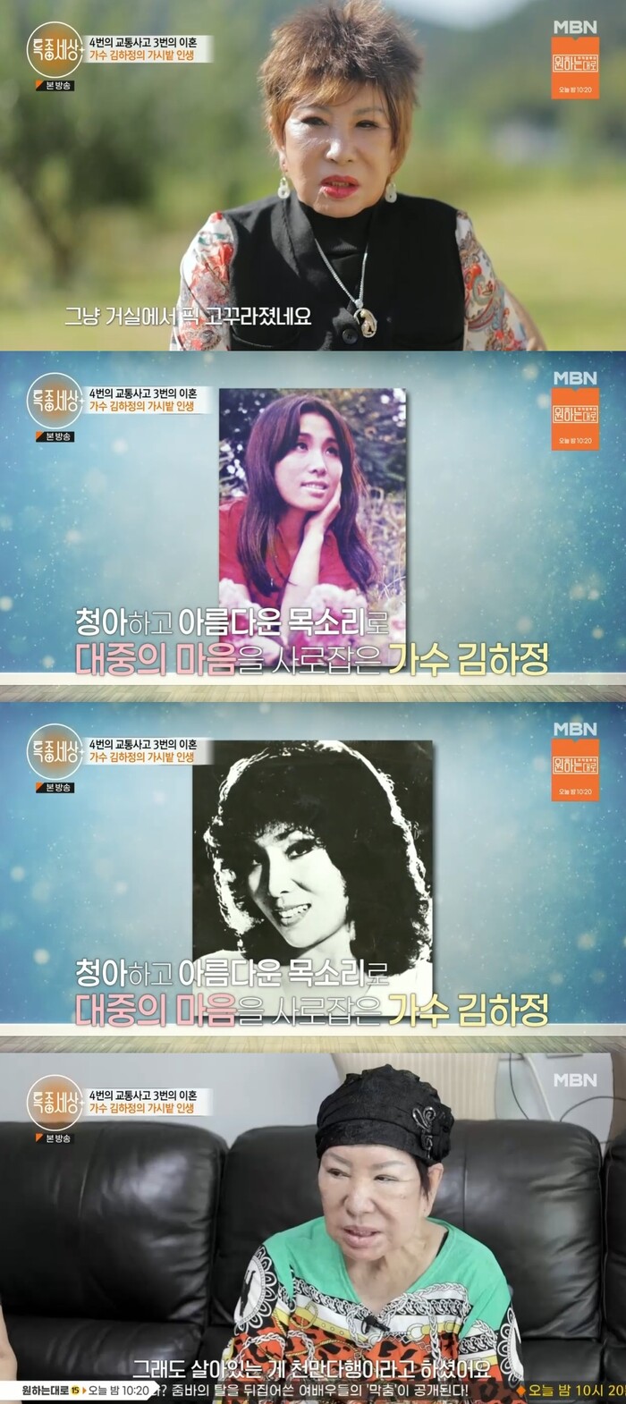 김하정은 "이혼을 하고 나면 징크스처럼 교통사고를 당했다"며 "첫번째 이혼 후 공연을 하고 올라오다가 낭떠러지로 떨어지는 사고를 당했고 척추와 목뼈를 다쳐서 요추 1,2번이 협착돼 키가 3cm 줄었다"고 했다.