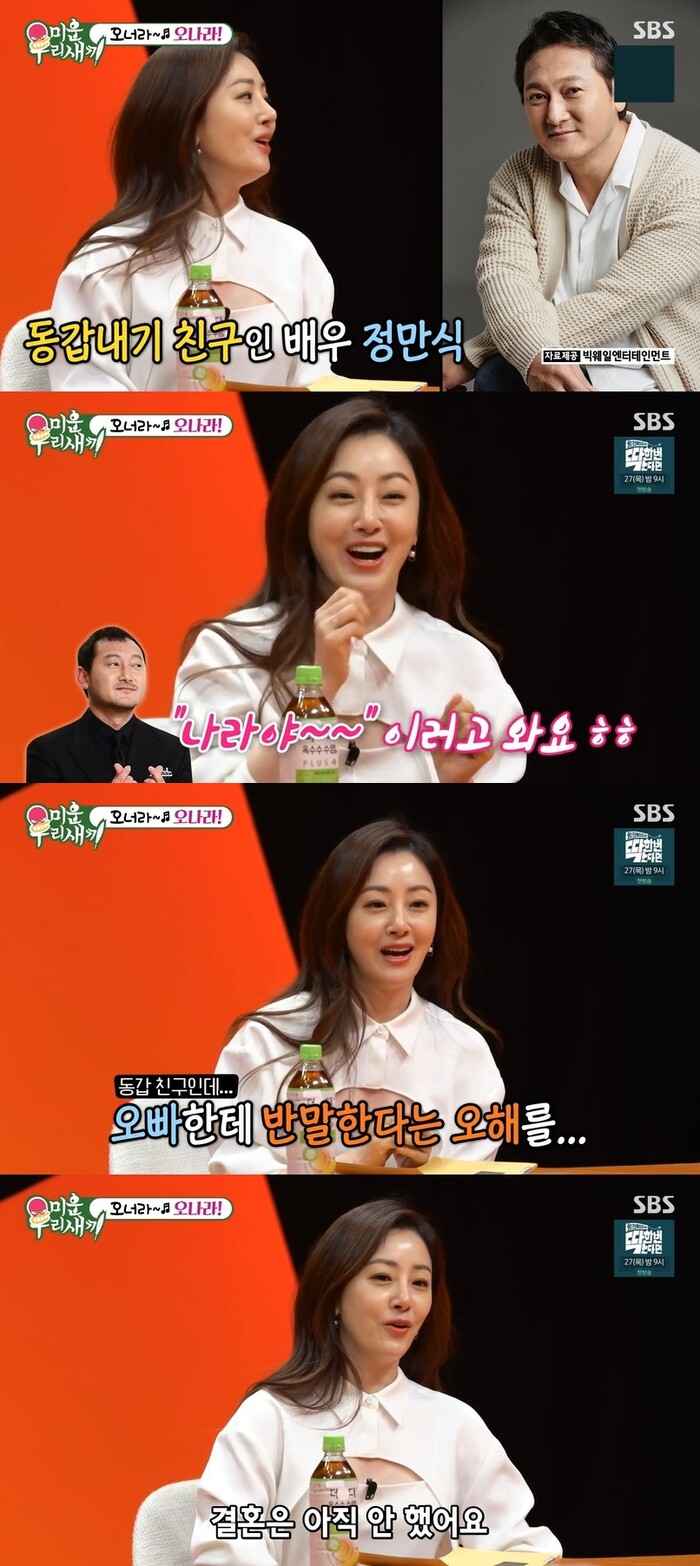오나라는 동갑내기인 정만식 때문에 그런일이 생겼다면서 "제가 '만식아' 그러면 '나라야~'하는데 사람들이 보면 오빠한테 반말한다는 오해를 샀던 적이 있다"며 "근데 지금은 다들 알고 있으니까 괜찮다"고 말했다.