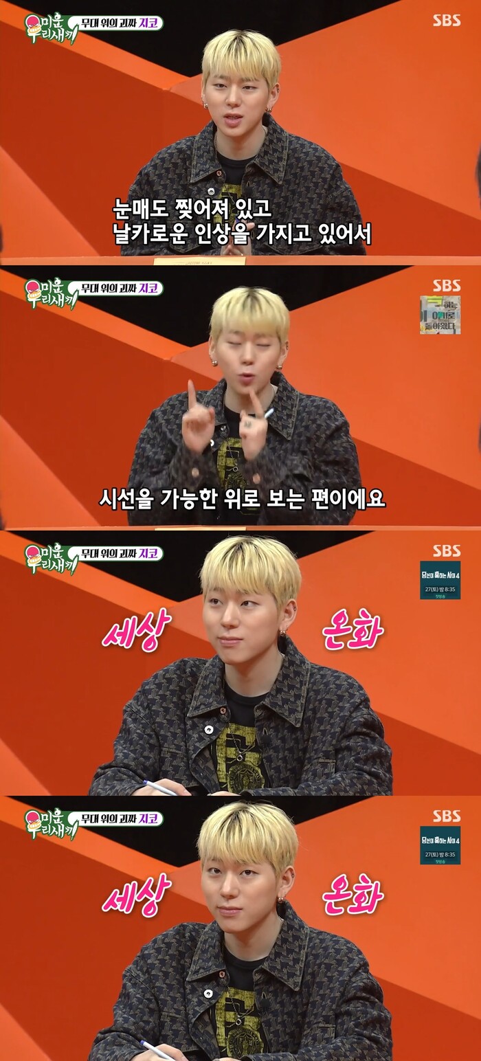 그러자 지코는 "제가 눈매도 찢어져 있고 날카로운 인상을 갖고 있어서 시선을 가능한 한 위로 보려고 한다"라고 말했다.