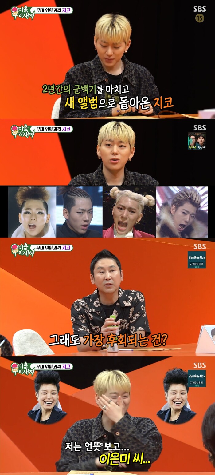 지코는 블락비 시절 헤어스타일 사진들이 등장하자 쭉 지켜 보며 "저 다 후회가 되는 것 같다"고 밝혔다. 그러자 신동엽은 "그래도 한 장을 고르라면 뭐냐"고 재차 질문했다.
