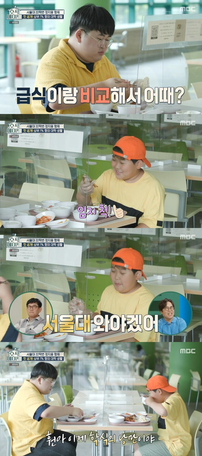 이어 두 사람의 학식 먹방도 펼쳐졌다. 서울대 학식을 처음 먹게 된 동생 정지훤은 그 맛과 퀄리티에 크게 감탄했다. 정지훤은 형을 향해 엄지를 치켜올리며 "학식 때문에 서울대에 입학해야겠다"고 말해 큰 웃음을 안겼다.