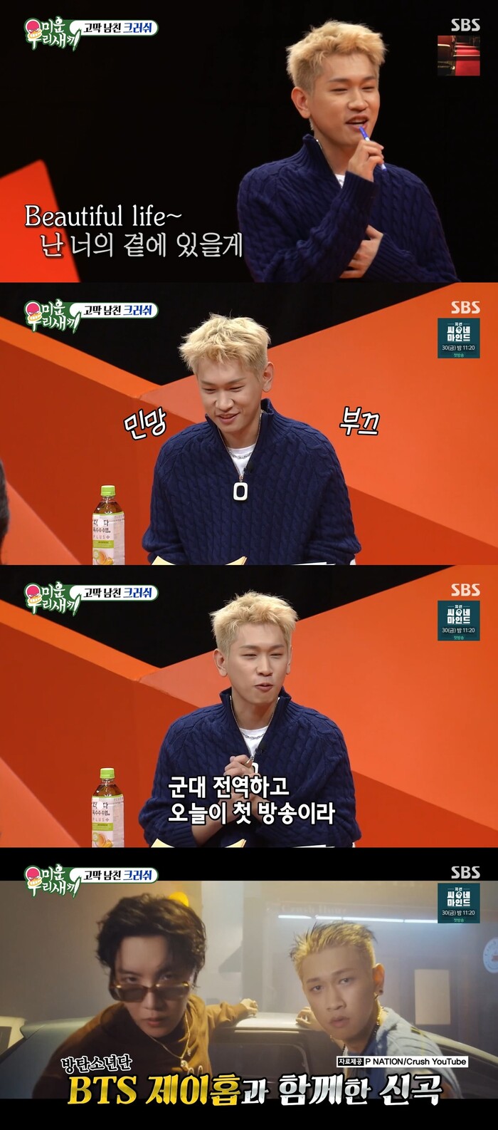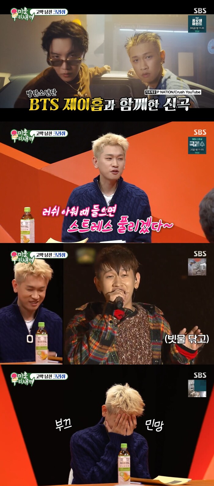 이어 크러쉬는 제대 후 신곡 '러쉬 아워'로 돌아온 것에 대해 언급했고 신동엽은 "이번에 신곡이 발매가 됐는데 어마어마한 분이 도와주셨다고 한다"고 말하자 크러쉬는 "BTS 제이홉 님이 함께 했다"고 전했다.