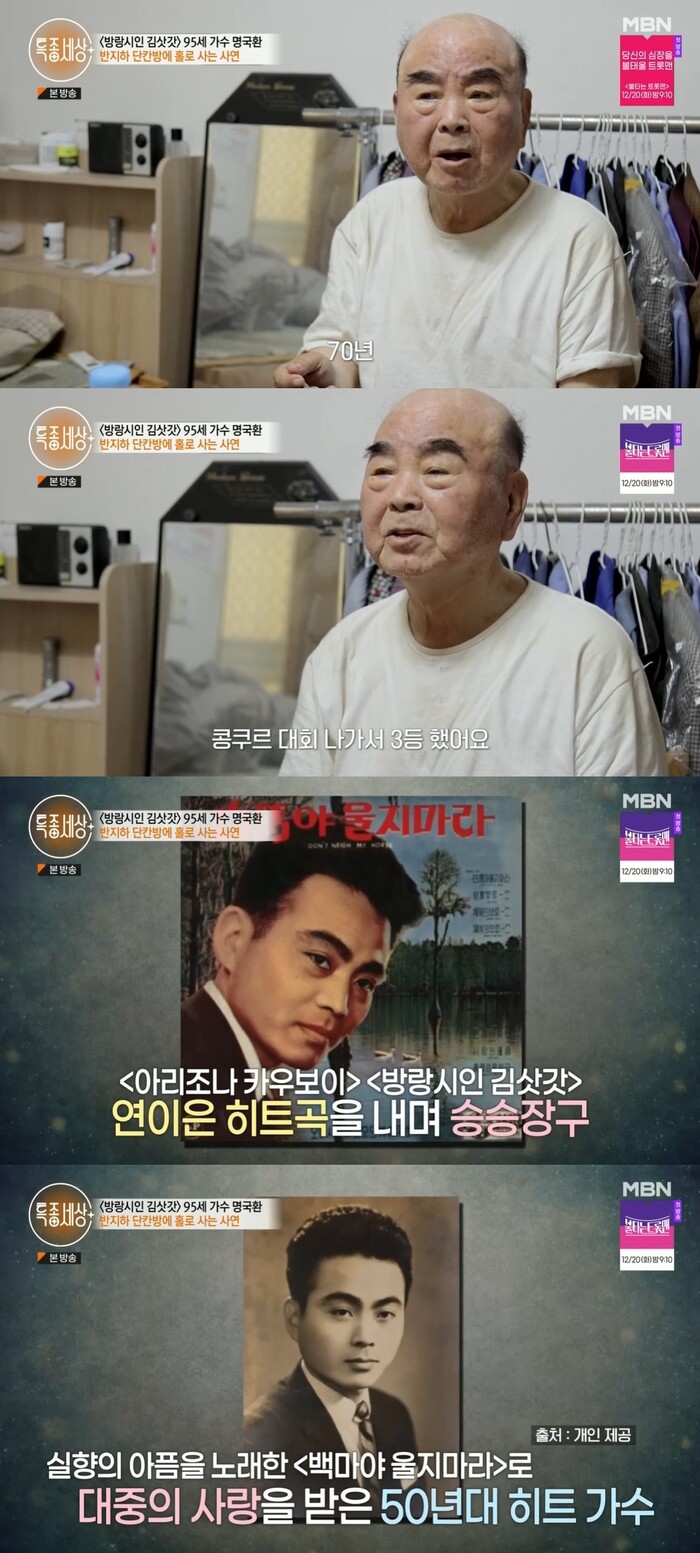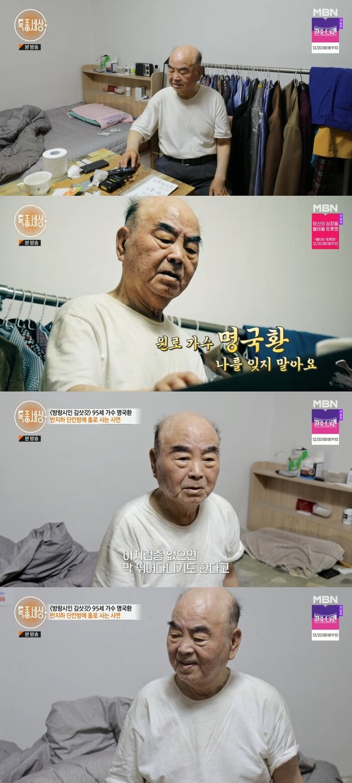 1950년대 실향민의 아픔을 노래했던 원로 가수 명국환은 정부 보조금으로 반지하 단칸방에 혼자 살고 있었다. 오랜 기간 갈아입지 못한 듯한 옷차림과 정리되지 않은 방은 물론 발톱도 깎지 못해 길어진 모습이었다.
