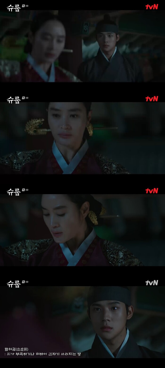 23일 밤 9시 10분 방송된 tvN '슈룹'(연출 김형식/극본 박바라)4회에서는 세자(배인혁 분)의 병을 알게 된 성남대군(문상민 분)의 모습이 그려졌다.