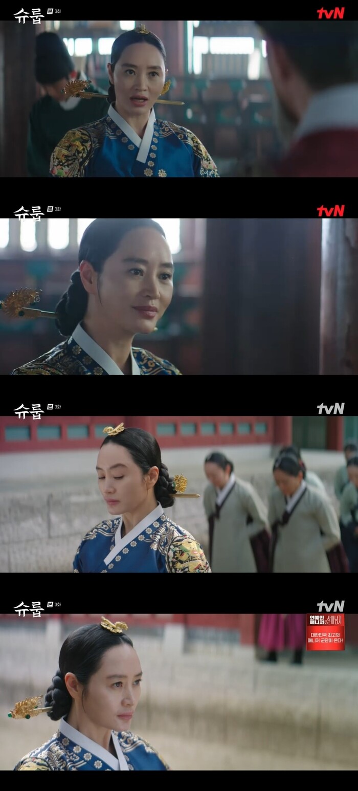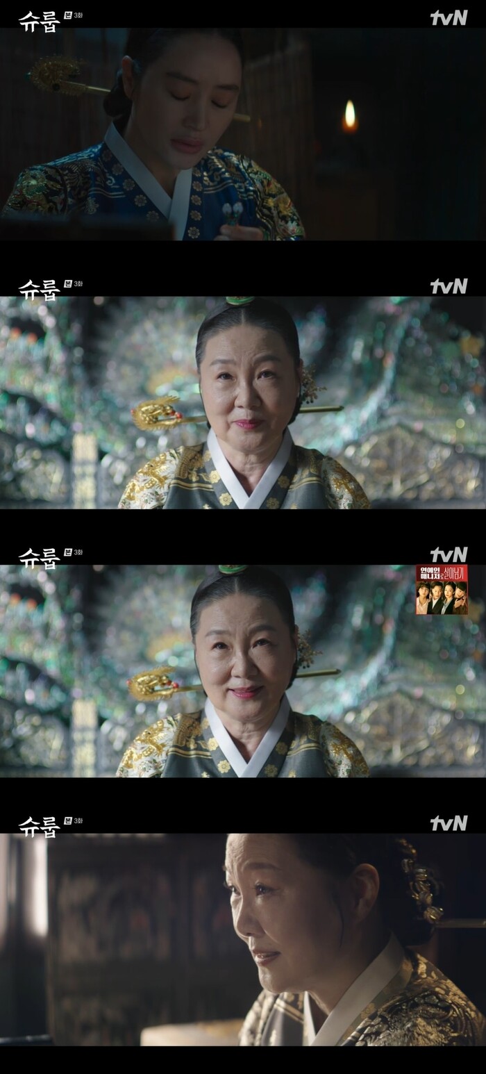 22일 밤 9시 10분 방송된 tvN '슈룹'(연출 김형식/극본 박바라)3회에서는 대비(김해숙 분)가 고귀인(우정원 분)의 고발을 듣는 모습이 그려졌다.