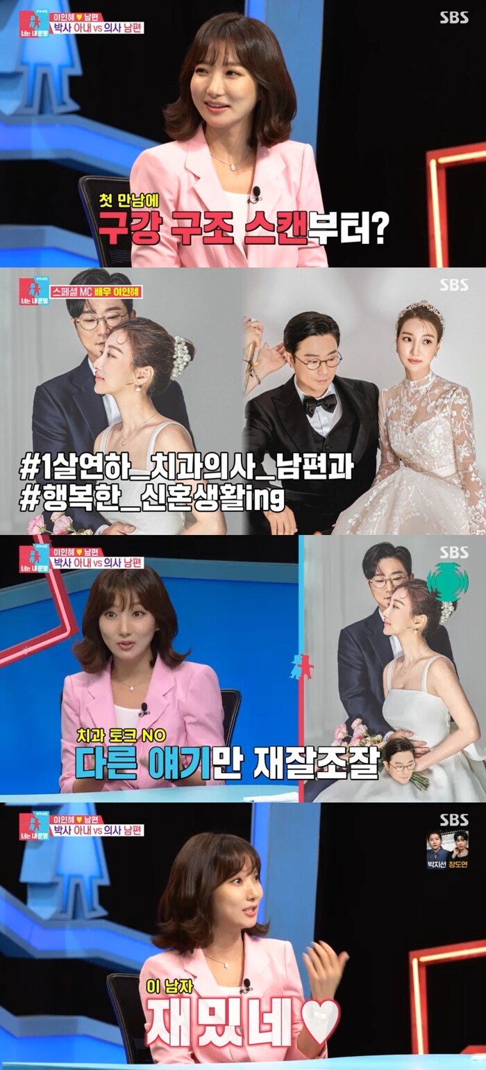 이에 이인혜는 "처음 만났을 때 이과생인데 드라마 어떠냐, 예능 어떠냐고 물어서 예술에 관심이 많은 친구구나 했는데 TV 보면서 저 친구는 치아를 넣으면 예쁠 텐데, 턱 교정을 했어야 하는데 무 그런 이야기를 하더라"며 "그래서 내가 '왜 내치아는 안봤냐'고 물어봤더니 '치아관리 잘하더라'고 하더라"고 말했다. 이인혜는 남편이 이미 자신의 구강구조 상태를 다 파악한 상태였다고 했다.