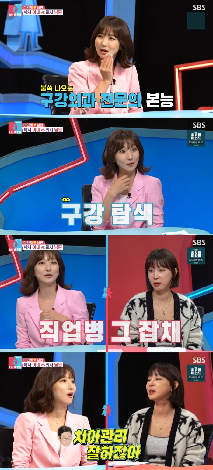 1살 연하 치과의사와 결혼한 이인혜에게 김숙은 "남편이 치과의사라 치아 집착을 한다더라"며 "첫 만남에 구강구조 체크를 했다고 한다"고 물었다.