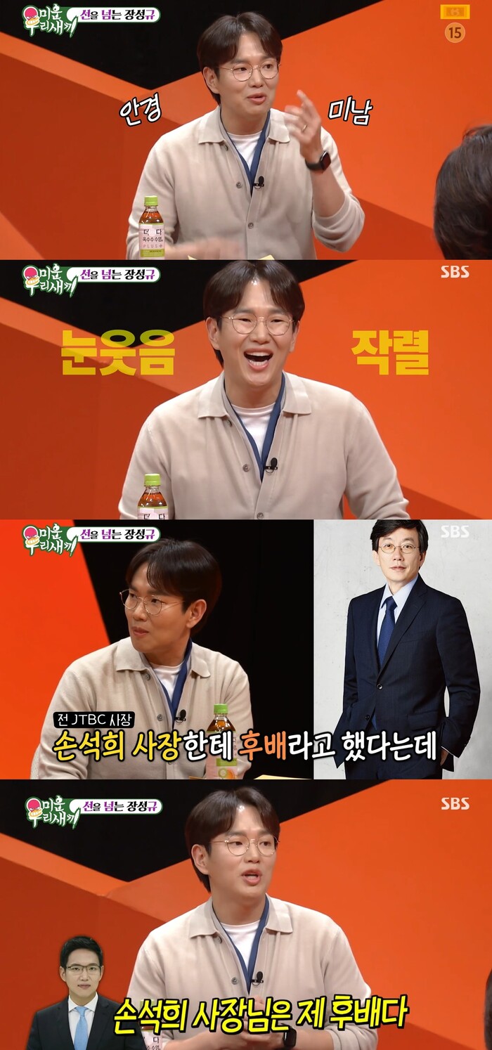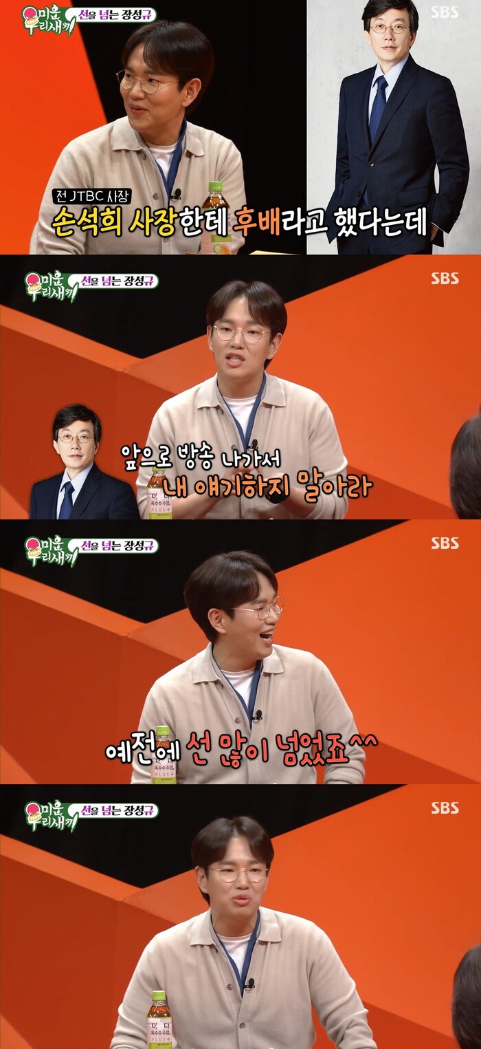 이날 방송에서 MC 서장훈은 "장성규가 선을 잘 넘는 사람답게 예전에 손석희 사장한테 '내 후배'라고 얘기했다가 호되게 혼났다더라"고 했다.