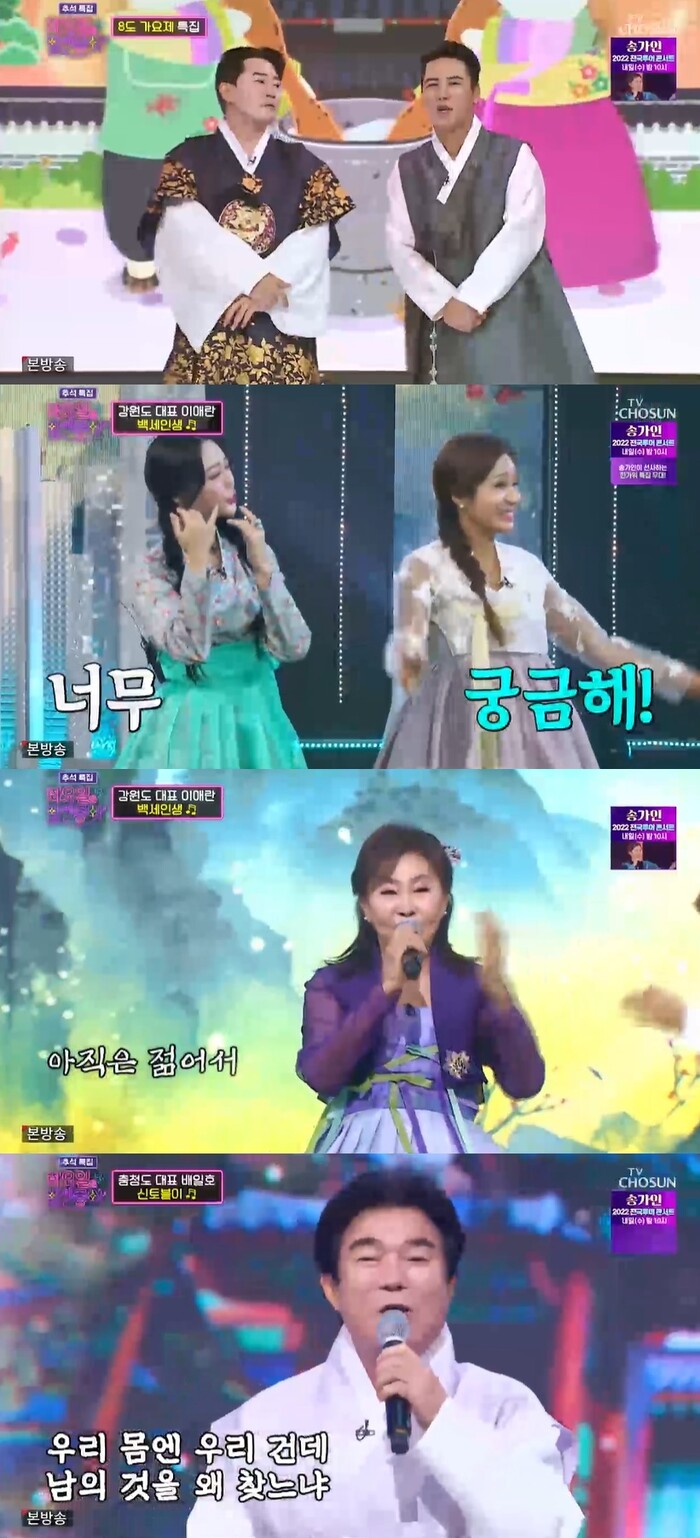 6일 밤 10시 방송된 TV조선 '화요일은 밤이 좋아'에서는 추석 특집으로 서울·경기 대표 김혜연, 충청 대표 배일호, 강원 대표 이애란, 전라 대표 현숙, 경상 대표 정훈희, 제주 대표 한서경이 출연해 치열한 노래 대결을 펼치는 모습이 그려졌다.