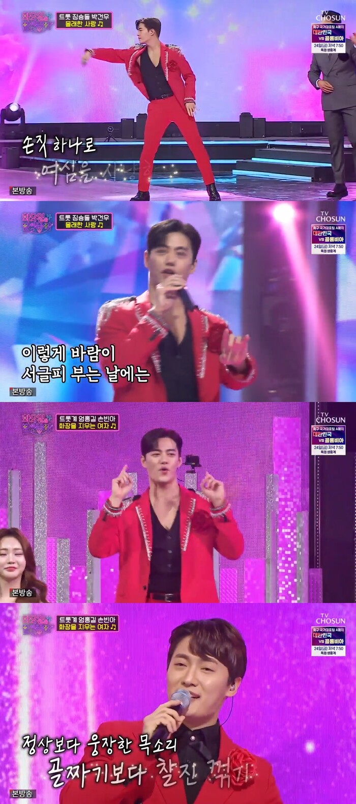 박건우는 고음여신 은가은과 핑크빛 기류를 형성한다. 이날 은가은은 무대 도중 결혼식 상황극을 펼치기도 했다. 결혼식 사회는 붐, 주례는 장민호, 대망의 결혼 상대로 불꽃 미남 박건우가 나섰다. 일일 신랑 역할로 등장한 박건우에 은가은은 올라가는 입꼬리를 감추지 못했다. 급기야 무대 내내 노래에 집중하지 못하는 모습을 보여 모두의 웃음을 자아냈다.