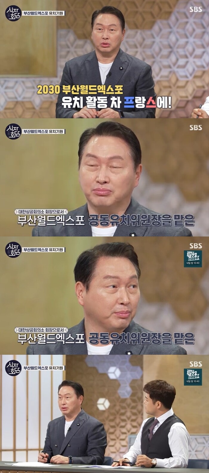 이날 방송에서 최태원 회장은 2030부산월드엑스포 유치 활동 차 프랑스에 갔다고 했다. 여기서 공동유치원장을 맡은 것이다.