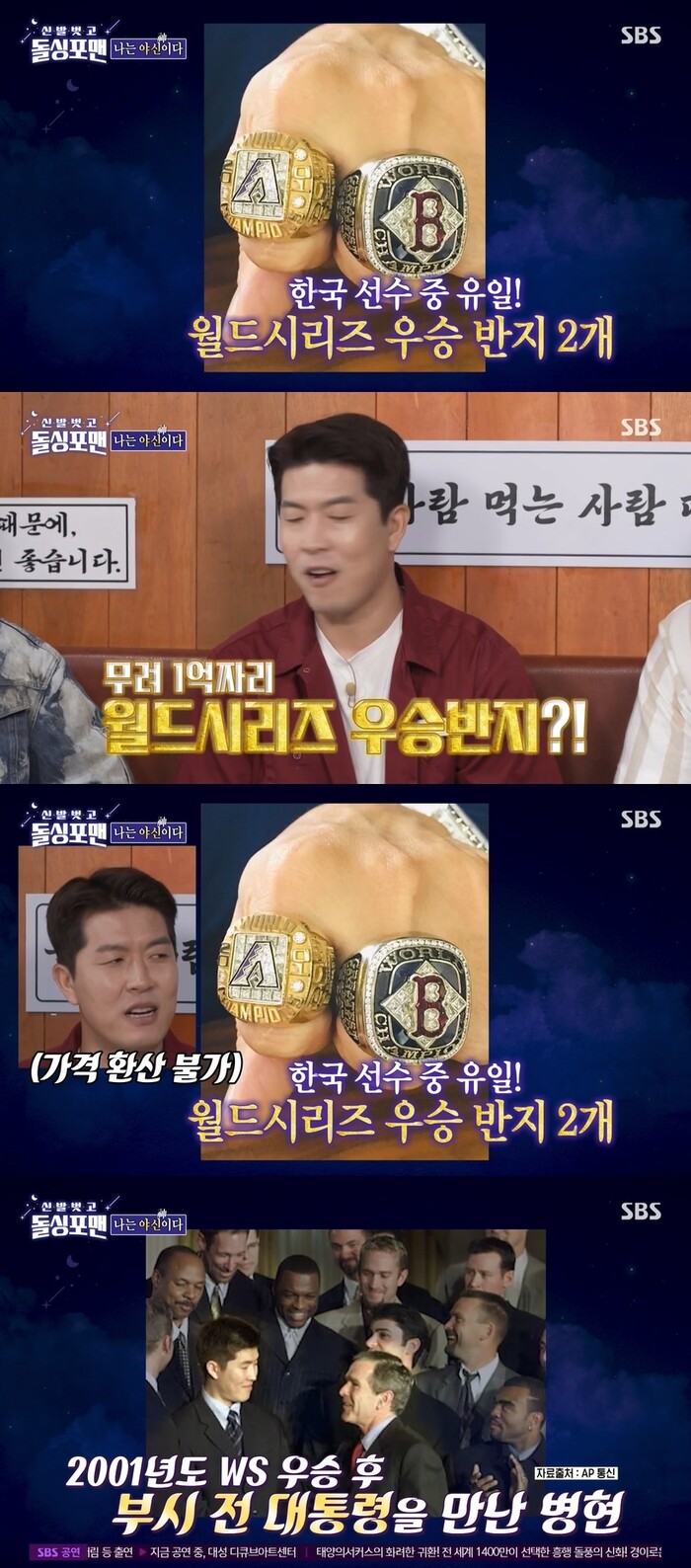 이에 김병현은 "가격은 매길 수가 없다"며 "그냥 사람들이 그럴거라고 다들 예상을 한거다"고 설명했다. 우승하고 백악관 초청을 받았다는 김병현은 "2001년도에 부시 대통령을 만났다"고 언급했다. 그러면서도 "Nice meet you까지만 한게 생각난다"고 해 웃음을 자아냈다.