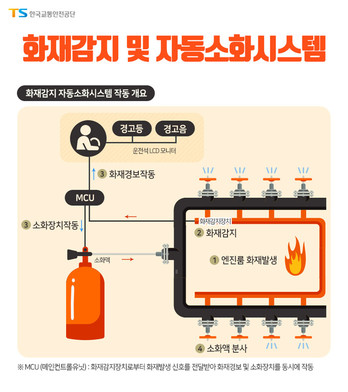 공단이 개발한 시스템은 화재감지, 경보, 소화장치 3개 부분으로 구성되어, 감지 및 소화 노즐 장치를 라인으로 설치하여 엔진룸 내부 어디에서든 화재 감지 및 완전 소화가 가능하도록 설계되었다.