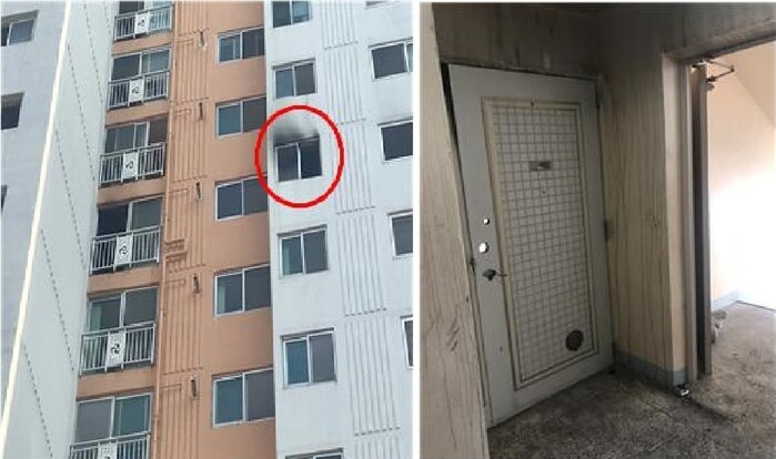 독자가 제보한 사진을 보면 나주시 사고 아파트의 대피계단이 열려 있는 것을 볼 수 있다. 붉은 선 안은 불이 나 외벽이 그을린 모습이다. 독자 제보
