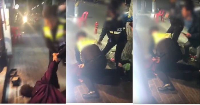 구로경찰서 남녀 경찰관이 취객을 제압하는 과정에서 여경이 취객에게 떼밀리는 장면.