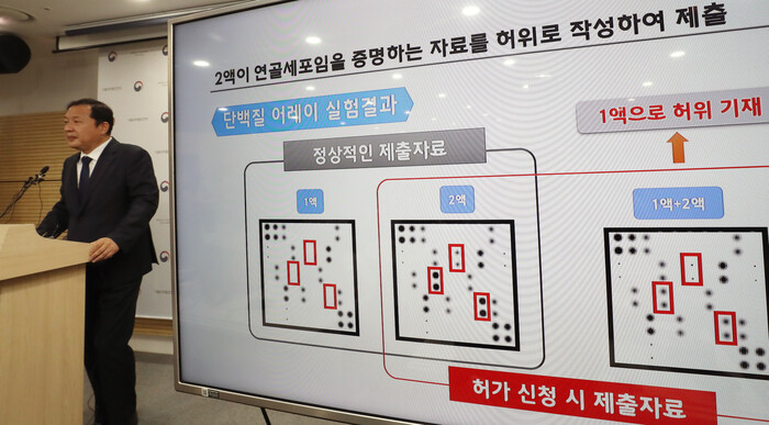 강석연 식약처 바이오생약국장은 브리핑을 통해 “인보사 성분중 2액이 허가당시 제출한 자료에 기재된 연골세포가 아닌 신장세포로 확인됐고, 당시 제출했던 자료가 허위로 밝혀졌다”고 말했다.