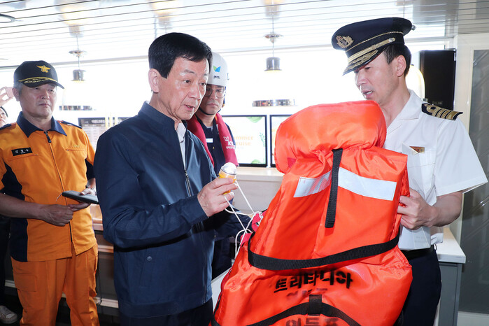 진영 행정안전부 장관이 2일 오후 서울 한강 여의도 선착장의 유람선을 찾아 선박의 안전운항 및 구명복 비치 관리 등을 점검하고 있다. 행정안전부 제공.