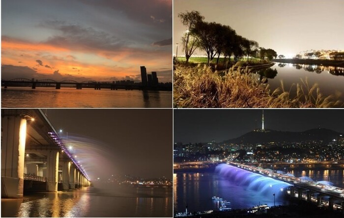 서울시가 운영하는 한강 야경투어의 주요 장소로, 왼쪽 위부터 시계방향으로 반포한강공원, 서래섬 야경, 반포대교의 달빛 무지개 분수. 서울시 제공