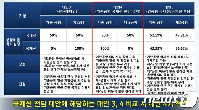 용역진은 기존 제주공항과 제2공항 역할 분담에 대해 7가지 대안을 놓고 실현 가능성을 검토한 결과, 기존 공항이 국제선 전체와 국내선 절반을 맡고 제2공항은 국내선 나머지 절반을 맡는 대안이 최적안이라고 제시했다.