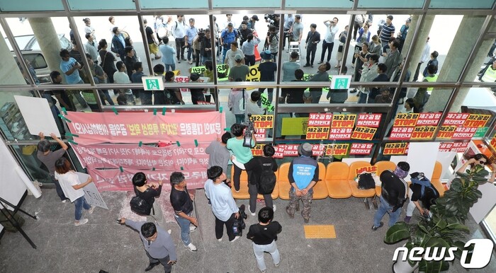 국토교통부는 이날 오후 3시 제주 농어업인회관에서 제주 제2공항 기본계획 수립용역 최종보고회를 개최하려고 했으나 반대 단체들의 강력한 반발로 결국 열리지 못했다.