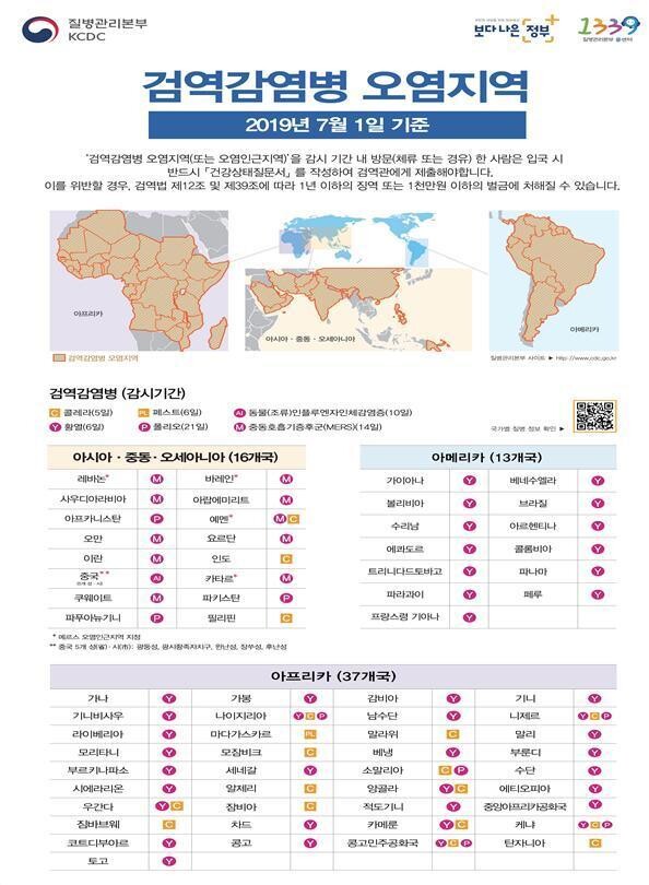 당국은 현재 해외에서 발생 중인 검역감염병 6종(콜레라, 페스트, 황열, 동물인플루엔자인체감염증, 중동호흡기증후군, 폴리오)에 대해 오염지역을 지정해 관리하고 있다.