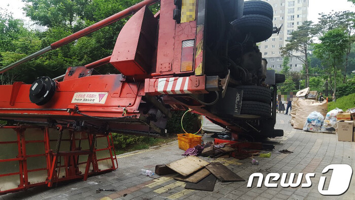 28일 오전 8시 50분쯤 김포시 운양동의 한 아파트에서 이삿짐을 옮기던 사다리 차가 쓰러져 도로를 달리던 차량을 덮쳤다.