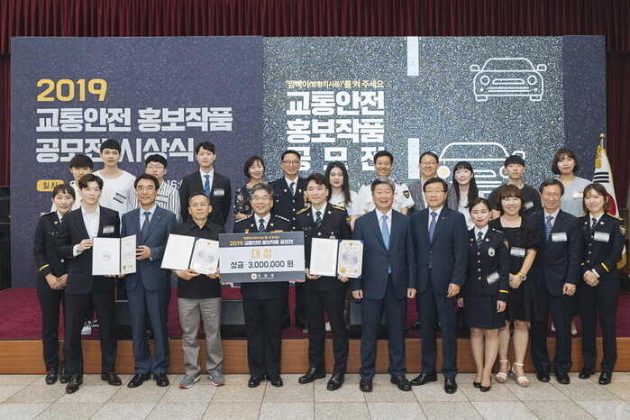 26일 경찰청에서 열린 ‘2019년도 교통안전 홍보작품 공모전 시상식’에서 민갑룡 경찰청장(앞줄 왼쪽에서 네번째)과 윤종기 도로교통공단 이사장(〃여섯 번째), 손해보험협회 서경환 전무(〃 일곱번째)가 수상자들과 기념촬영을 하고 있다. 도로교통공단 제공