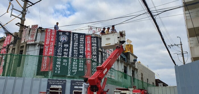 서울 청량리4구역 철거대상 건물옥상 농성 현장에선 지난 1월부터 이주대책과 추가 보상을 요구하며 5명이 옥상에서 장기 농성을 해왔다. 이들은 온몸을 쇠사슬로 묶고 LPG가스통을 폭파하겠다며 농성해왔다.