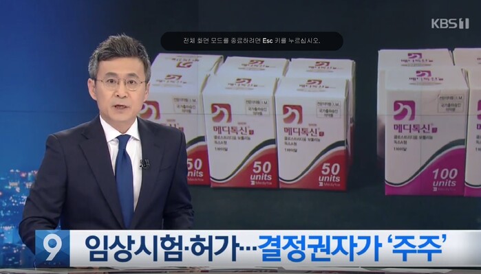 KBS는 전날 뉴스를 통해 메디톡신의 임상시험 통과를 판단하는 주요 결정권자들이 메디톡스사의 주식을 소유한 사실이 확인됐다고 보도했다. KBS는 지난 10일에는 메디톡스가 메디톡신의 안전성 검증도 안 받은 상태에서 시중에 유통했다는 의혹도 제기했다.