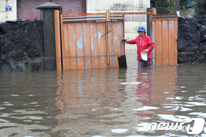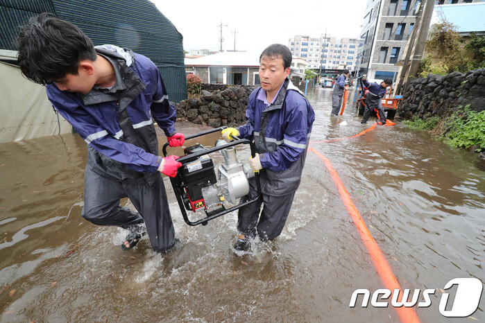 이 밖에도 성산(동부) 318.8㎜, 태풍센터(남부) 311.0, 선흘(북부) 251.0㎜, 신례(남부) 250.5㎜, 송당(동부) 237.5㎜, 산천단(북부) 224.0㎜, 서귀포(남부) 177.1㎜, 구좌(동부) 172.5㎜, 제주(북부) 120.6㎜, 마라도(서부) 39.5㎜의 강수량이 기록됐다.