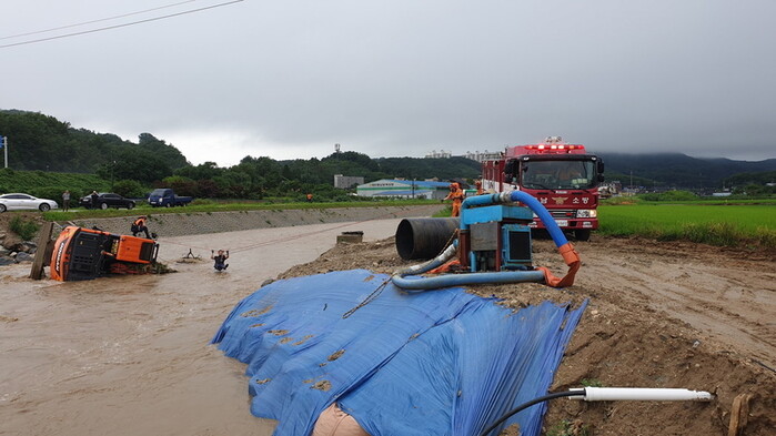 낮 12시 37분 목천읍 천정리 하천에서 폭우로 굴삭기가 전복돼 내부에 있는 근로자가 고립됐다가 119 구조대에 의해 구조됐다.
