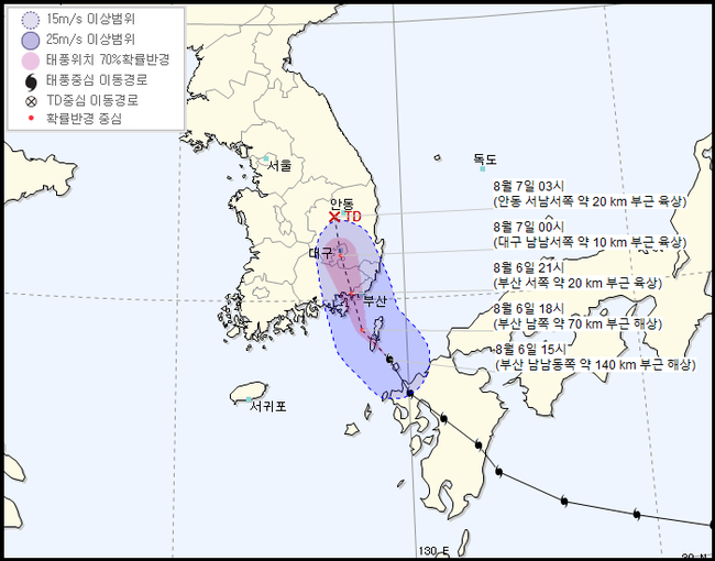 태풍은 7일 오전 경북 안동에서 열대저압부로 약화될 전망이다. 하지만 비구름대는 유지돼 많은 비와 강한 바람이 불 것으로 보인다.
