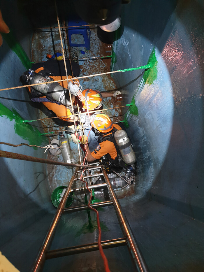 8일 오후 2시10분쯤 광주 광산구 신창동 한 빌딩 옥상 물탱크에서 방수작업을 하다 의식을 잃고 쓰러진 60대 남성을 119구조대가 구조하고 있다.(광주광산소방서 제공) 뉴스1