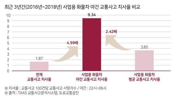 야간 화물차 교통사고 치사율은 전체 교통사고 치사율 1.87의 4.99배, 사업용 화물차 평균 치사율 3.85의 2.42배나 높다. 야간에 화물차 교통사고 일어나면 다른 시간대나 다른 차량들이 사고가 났을 때보다 훨씬 치명적인 것이다.