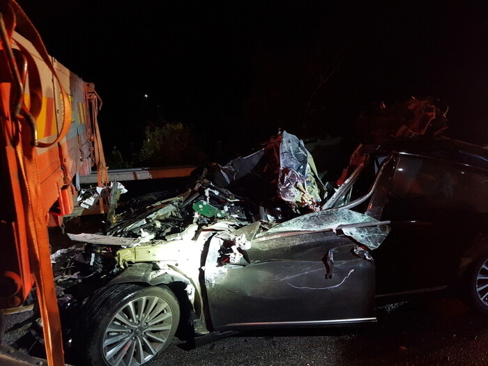 밤중에 사업용 화물차 교통사고가 나면 치명적이다. 지난 1일 오전 3시쯤 충남 서산시 대산읍 한 도로에서 승용차가 앞서가던 25톤 화물차를 들이받아 처참한 모습을 보이고 있다. 이 사고로 승용차 운전자와 동승자가 목숨을 잃었다. 뉴스1