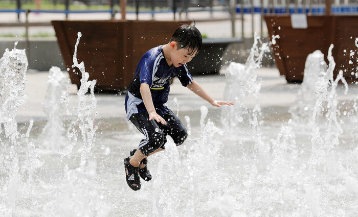 입추인 8일 서울 세종대로 광화문광장 분수대에서 어린이가 물장난을 하면서 더위를 식히고 있다. 뉴스1