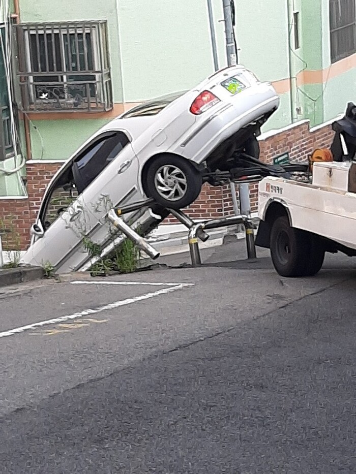 내리막길 왼쪽에 있는 건물과 도로와 표고 차이가 있다보니 자칫 좌회전을 잘못하면 전복될 위험이 있습니다.