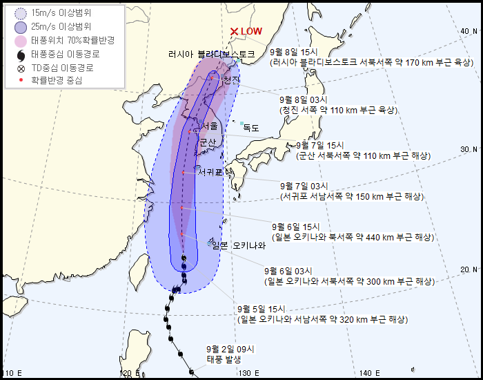 링링은 2000년 ‘쁘라삐룬’과 2010년 ‘곤파스’, 2012년 ‘볼라벤’과 유사한 경로를 보이고 있다. 링링의 강풍 반경은 300∼400㎞에 달해 한반도 전역에 거센 바람을 불러일으킬 전망이다.