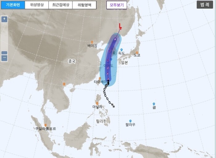 5일 기상청에 따르면 태풍 링링은 오후 3시 현재 일본 오키나와 서남서쪽 약 320㎞까지 북상했다. 중심기압은 940hPa로 강풍 반경이 370㎞에 이른다.
