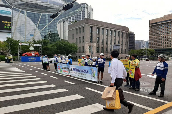 서울차없는날 조직위원회 자원봉사 회원들은 16일 출근길에 서울시청 앞 횡단보도에서 ‘2019 서울 차 없는 날(주간) 홍보캠페인’을 벌였다.