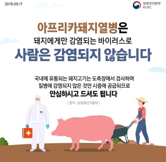 보건복지부 질병관리본부는 최근 경기도 파주에서 아프리카돼지열병(ASF)이 발생한 것과 관련해 보도자료를 내고 사람에게 감염되지 않는다고 17일 밝혔다